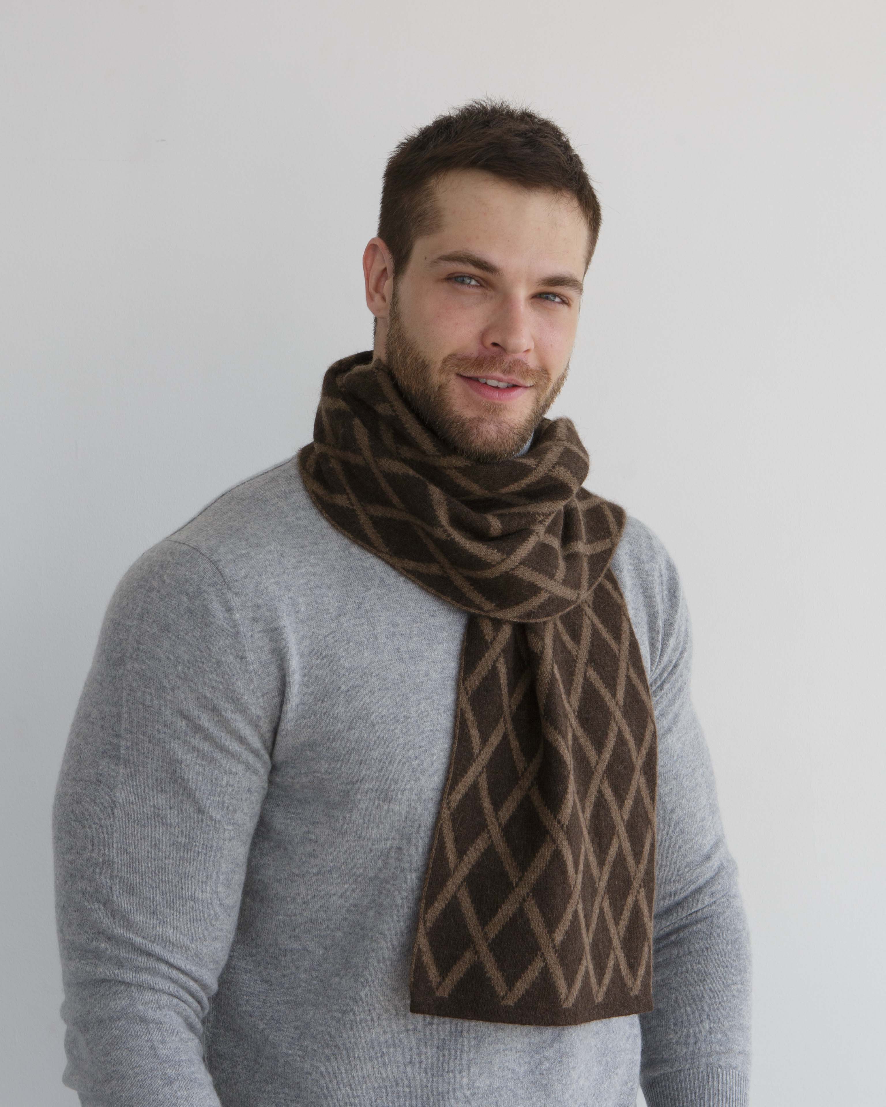 Классическая прямоугольная форма с контрастным геометрическим ромбовидным узором. Двухцветная вязка создаёт выразительный рисунок и подчёркивает текстуру изделия. Минималистичная отделка делает шарф стильным и современным аксессуаром.