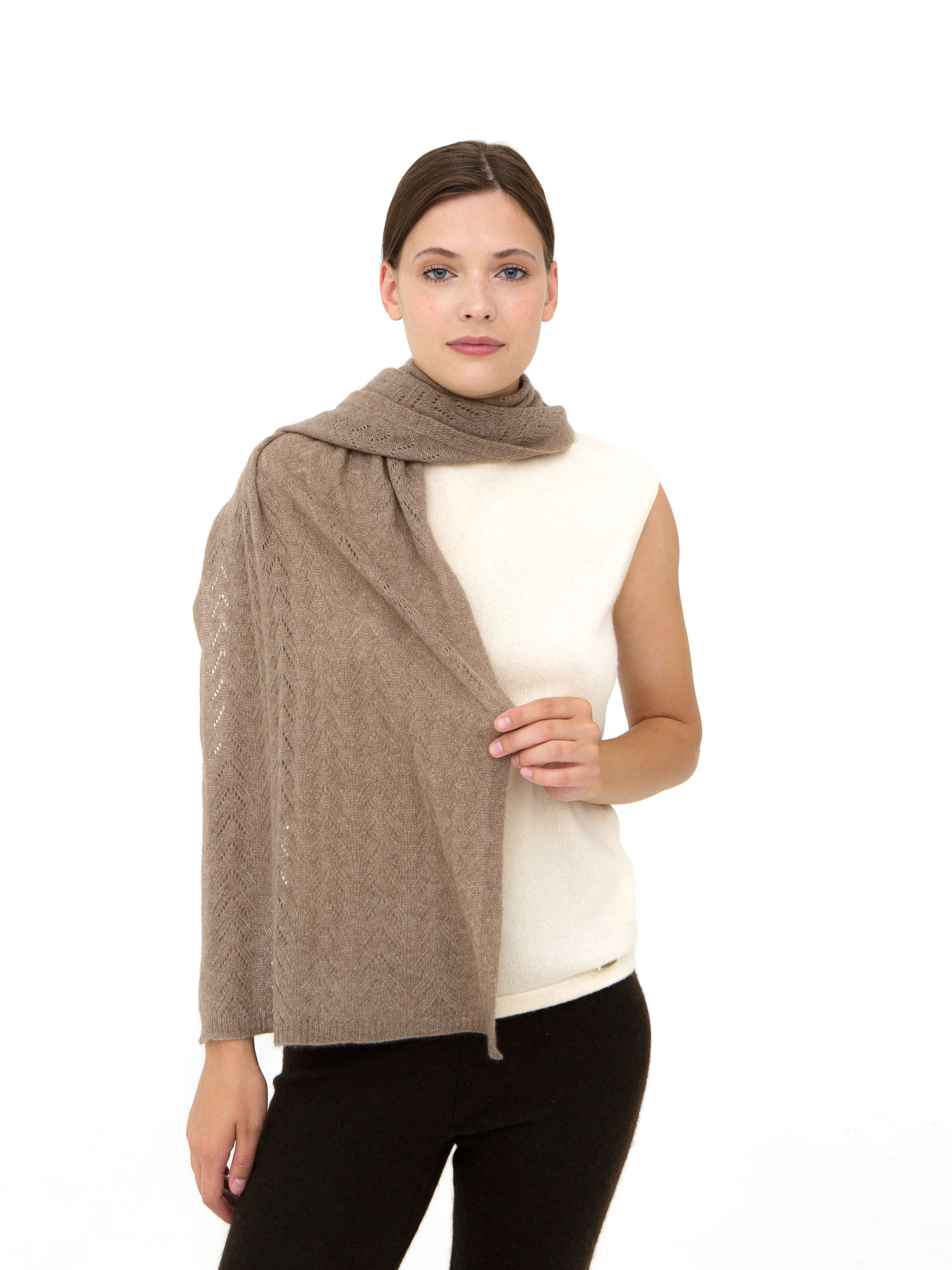 Модель выполнена в классической прямоугольной форме с мягкой фактурной вязкой. Минималистичный дизайн подчёркивает благородную текстуру кашемира и делает аксессуар универсальным для различных образов.