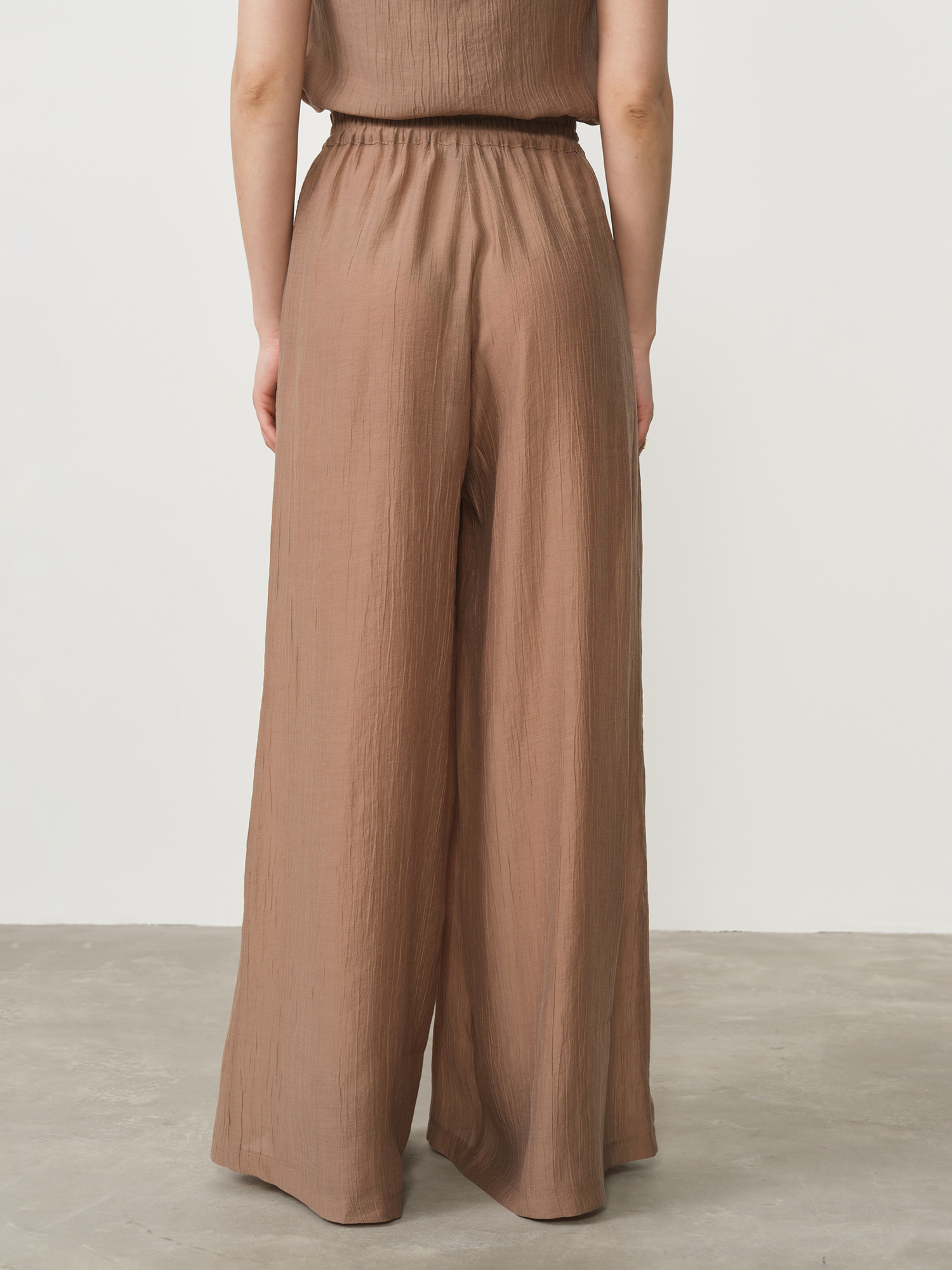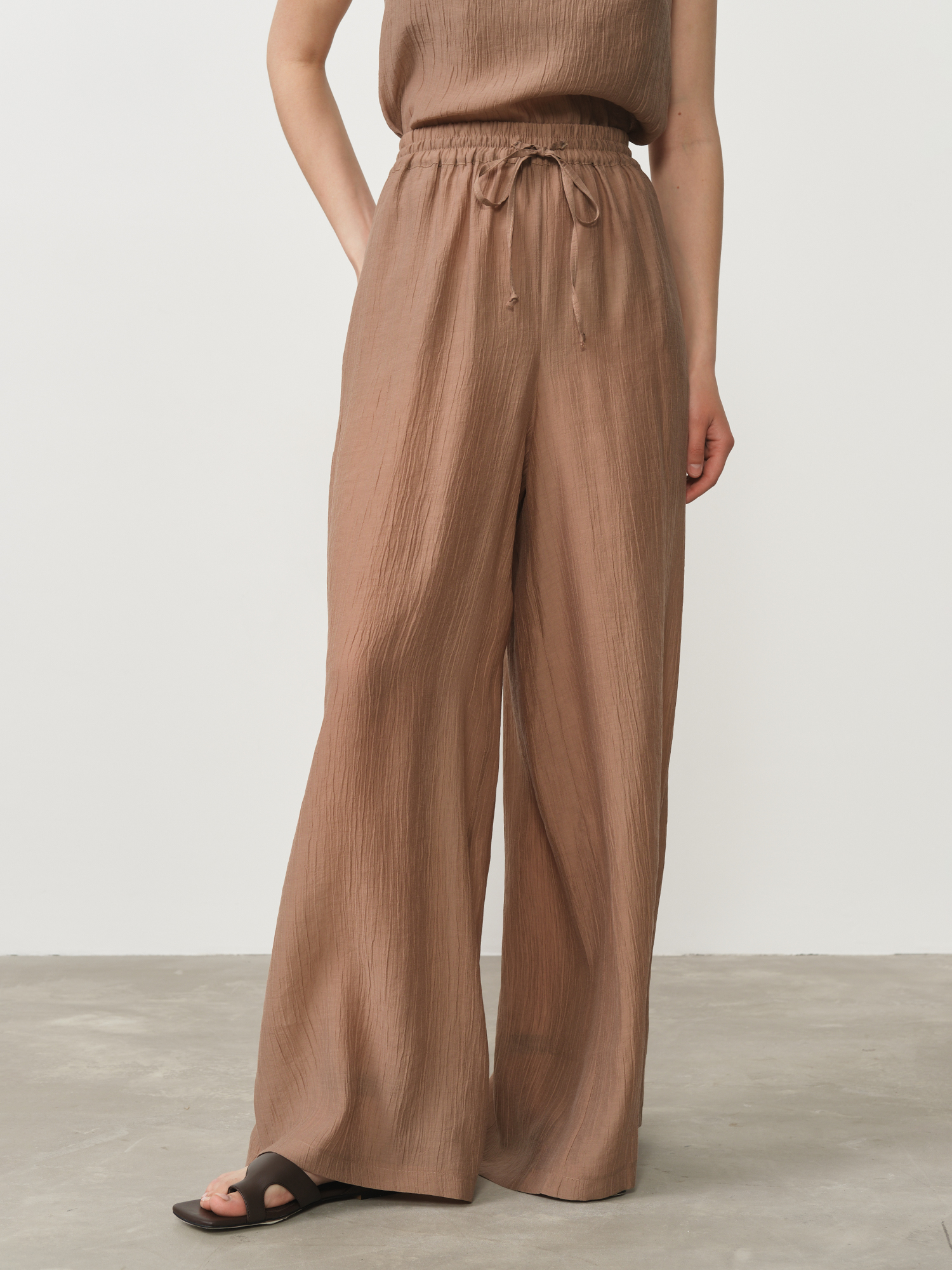 Модель выполнена в свободном крое, обеспечивающем максимальный комфорт и непринужденную элегантность. Эластичный пояс с декоративными завязками позволяет идеально адаптировать посадку по фигуре и создает стильный акцент. Благородный оттенок какао придает брюкам особую утонченность и универсальность – они прекрасно сочетаются как со светлыми, так и с темными верхними частями ансамбля.