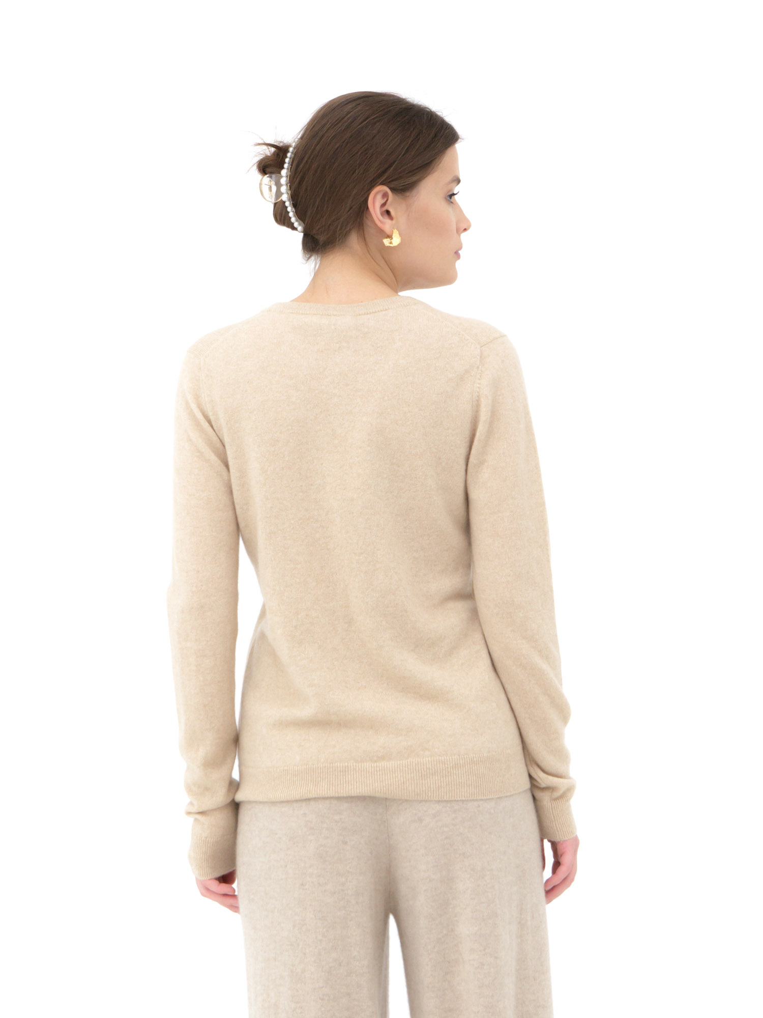 Модель выполнена в классическом прямом силуэте с аккуратным V-образным вырезом. Гладкая вязка подчёркивает благородную фактуру материала и делает изделие универсальным для разных стилей.