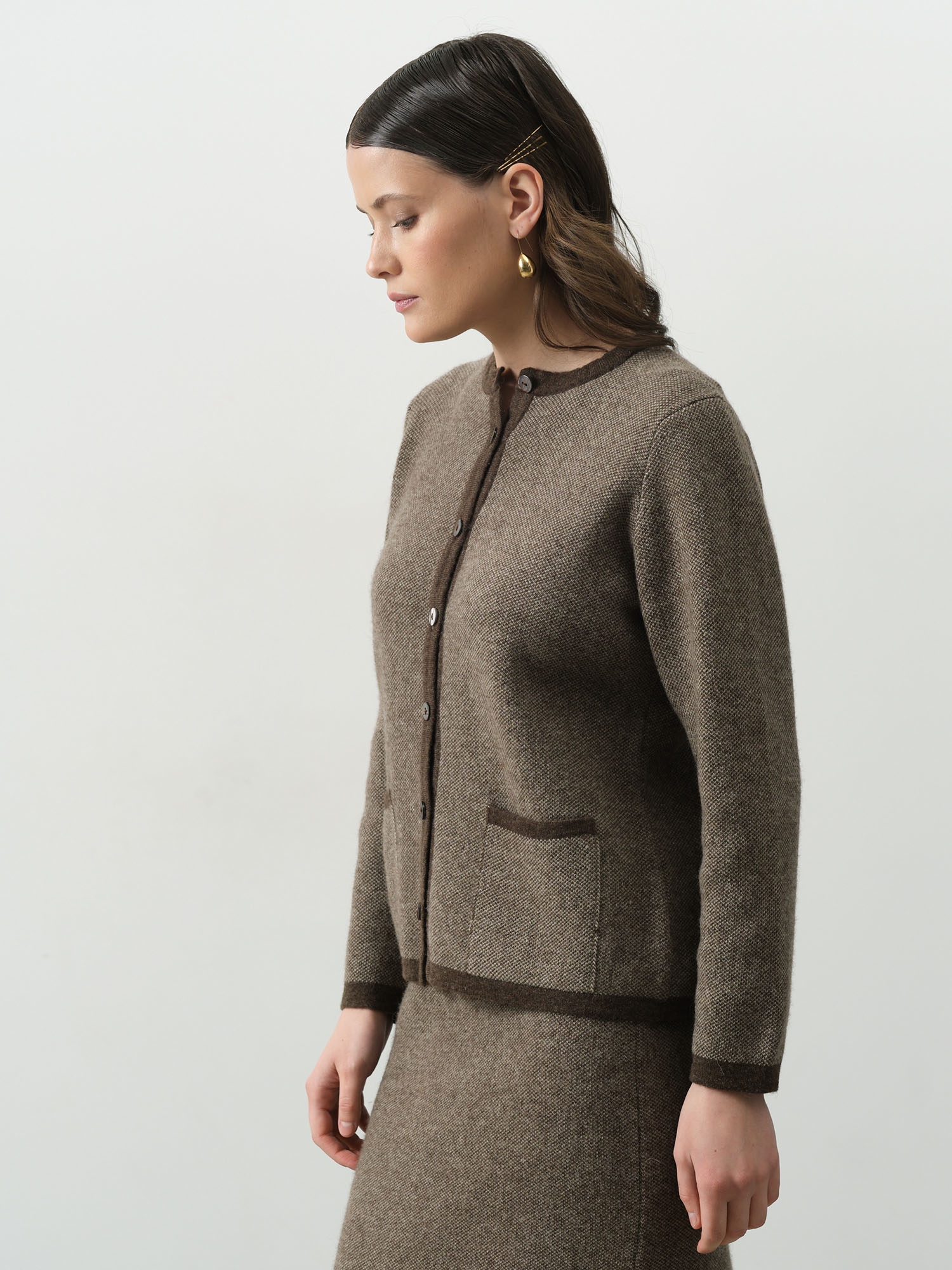 Сегодня купила этот красивый жакет, теперь к моей юбке из аналогичной шерсти есть комплект. Костюм смотрится отлично! Жакет тёплый, практичный, его можно носить с джинсами, брюками. Вещь удобная и комфортная, необходимая в гардеробе. Не только в межсезонье, но и прохладным летом отлично подойдёт. Разные шарики, кашне отлично дополнять образ. Рекомендую!
